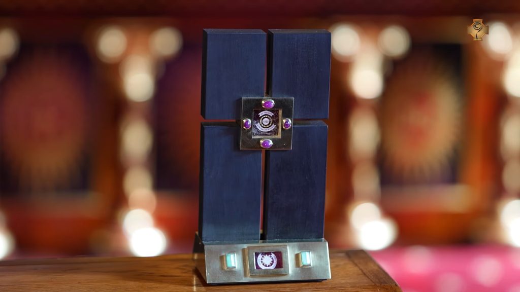 A székesfehérvári püspökök és pápák találkozásait bemutató teremben látható tárgy egyszerű geometrikus formákból áll, középpontjában pedig Páduai Szent Antal (1195-1231) négy rubin kabosonnal körülvett ereklyéje látható. A talp előoldalán középen egy hegyikristály lap mögötti lapos üregben Szent II. János Pál pápa ereklyéje látható két álló téglalap formájú, fazettált jade kő között, a hátoldalán pedig Szent Katharina Kasper (1820-1898) relikviája került egy hegyikristály-kaboson alá, két álló formátumú kaboson ametiszt közé.