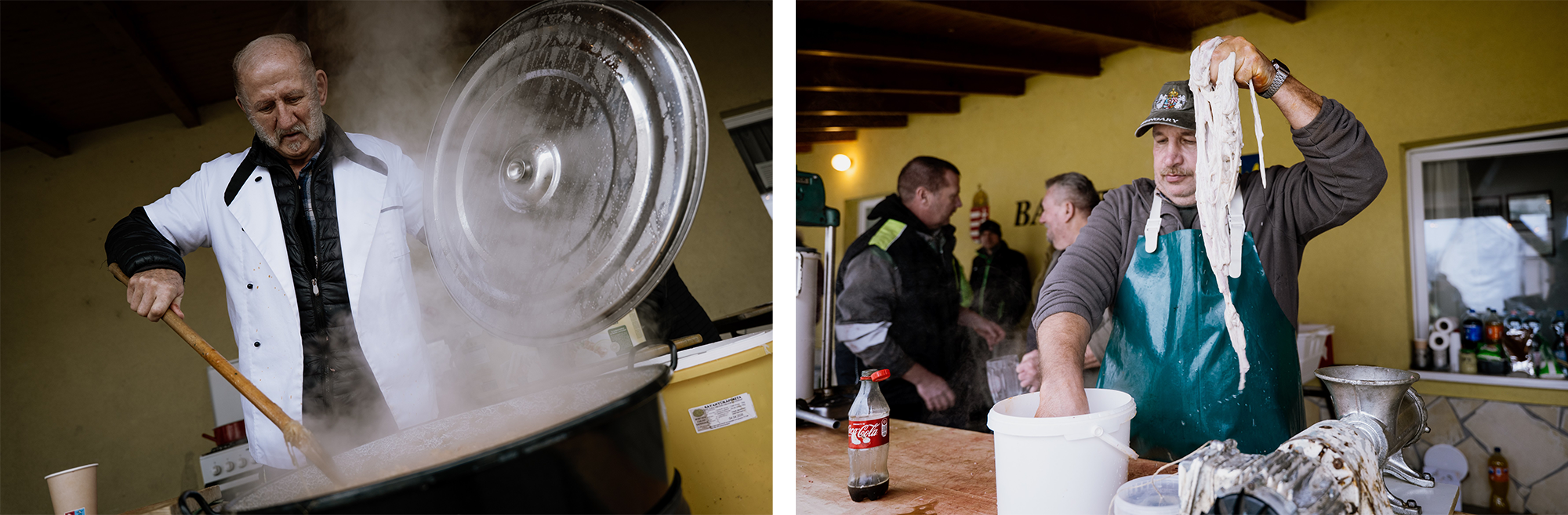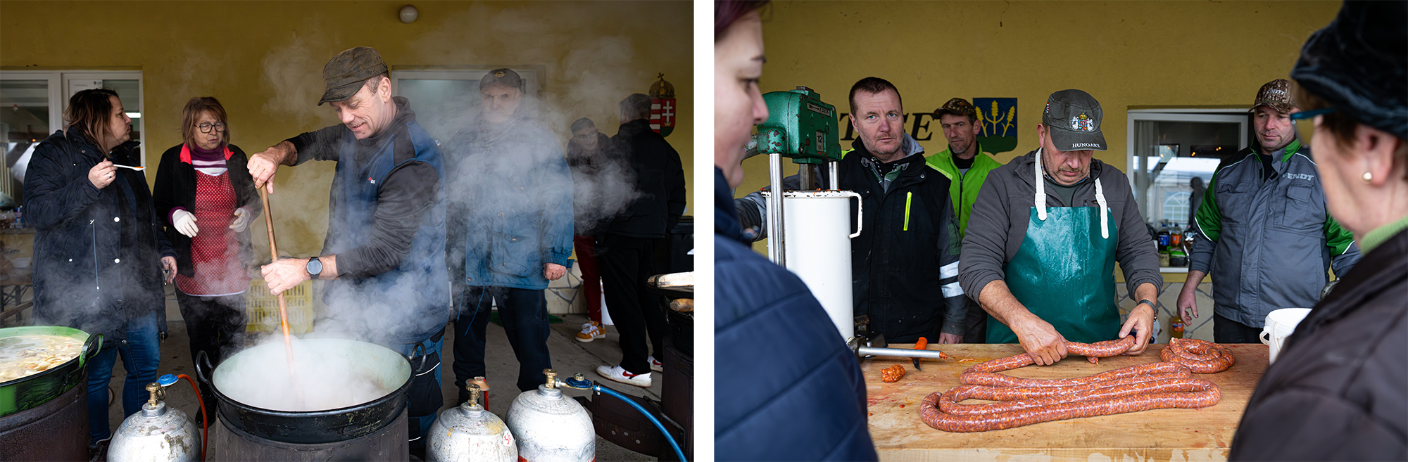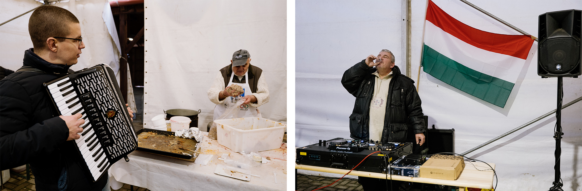 – fogadott minket az egyik szervező, miután kicsivel reggel 7 óra előtt, Győr-Moson-Sopron vármegye kátyúkkal szaggatott útjain megérkeztünk Beledre, ahol a környékbeli Tisza-szigetek disznóvágással egybekötött kampányeseményt szerveztek. A sátorban már a hajnali óráktól kezdve dolgoztak a böllérek, hogy délre kész legyen a sült hús, a hurka, a kolbász, a főtt máj és a töpörtyű.