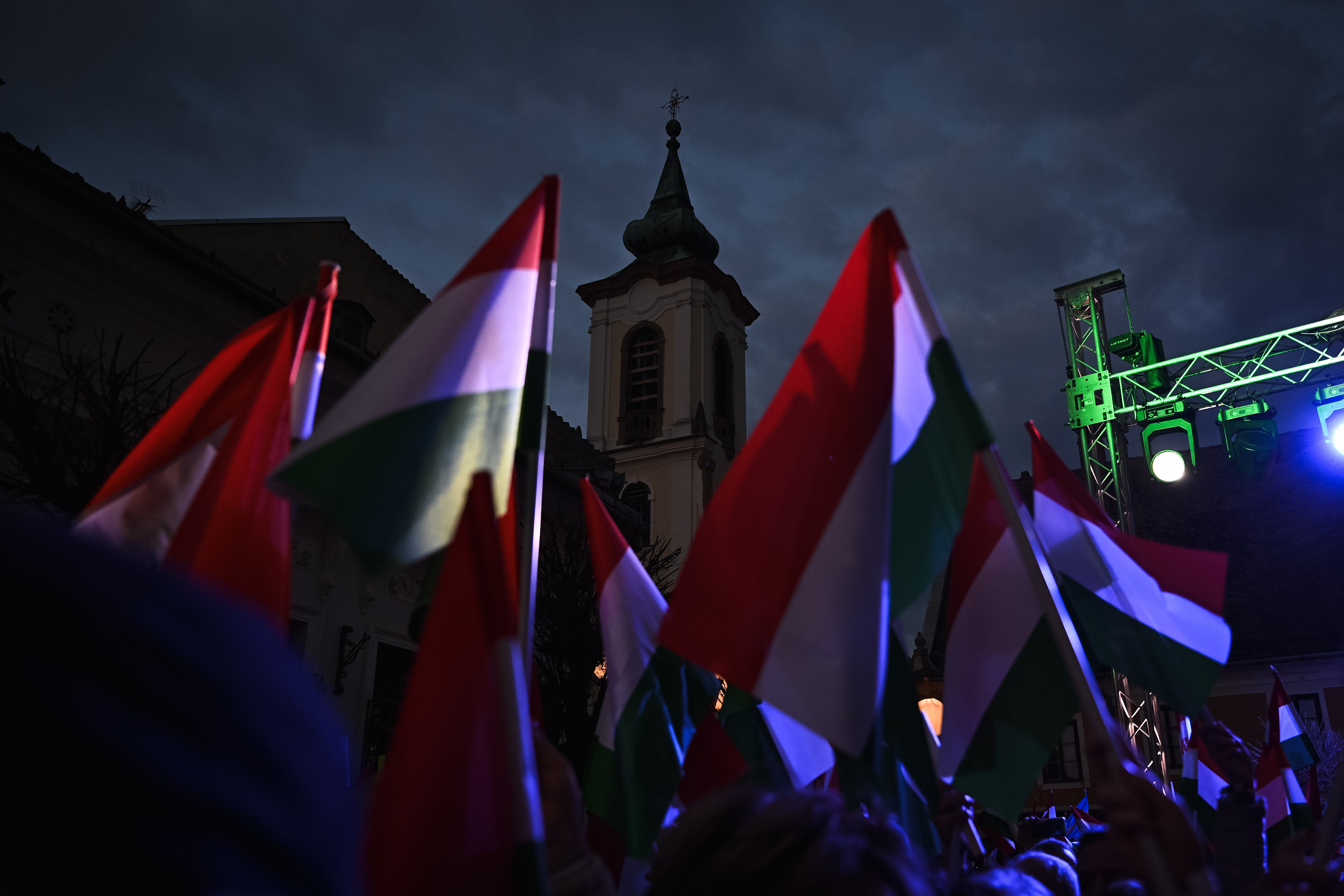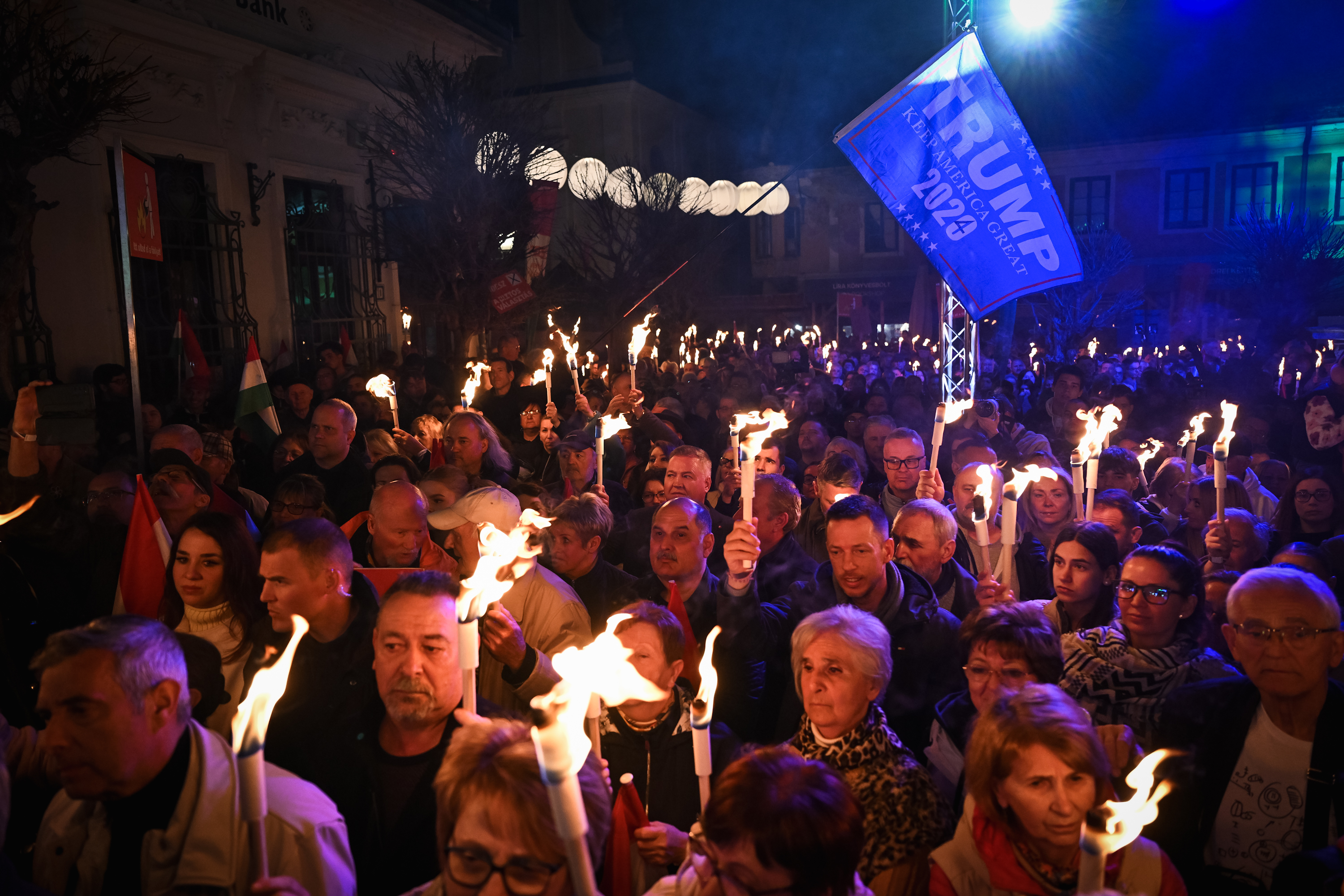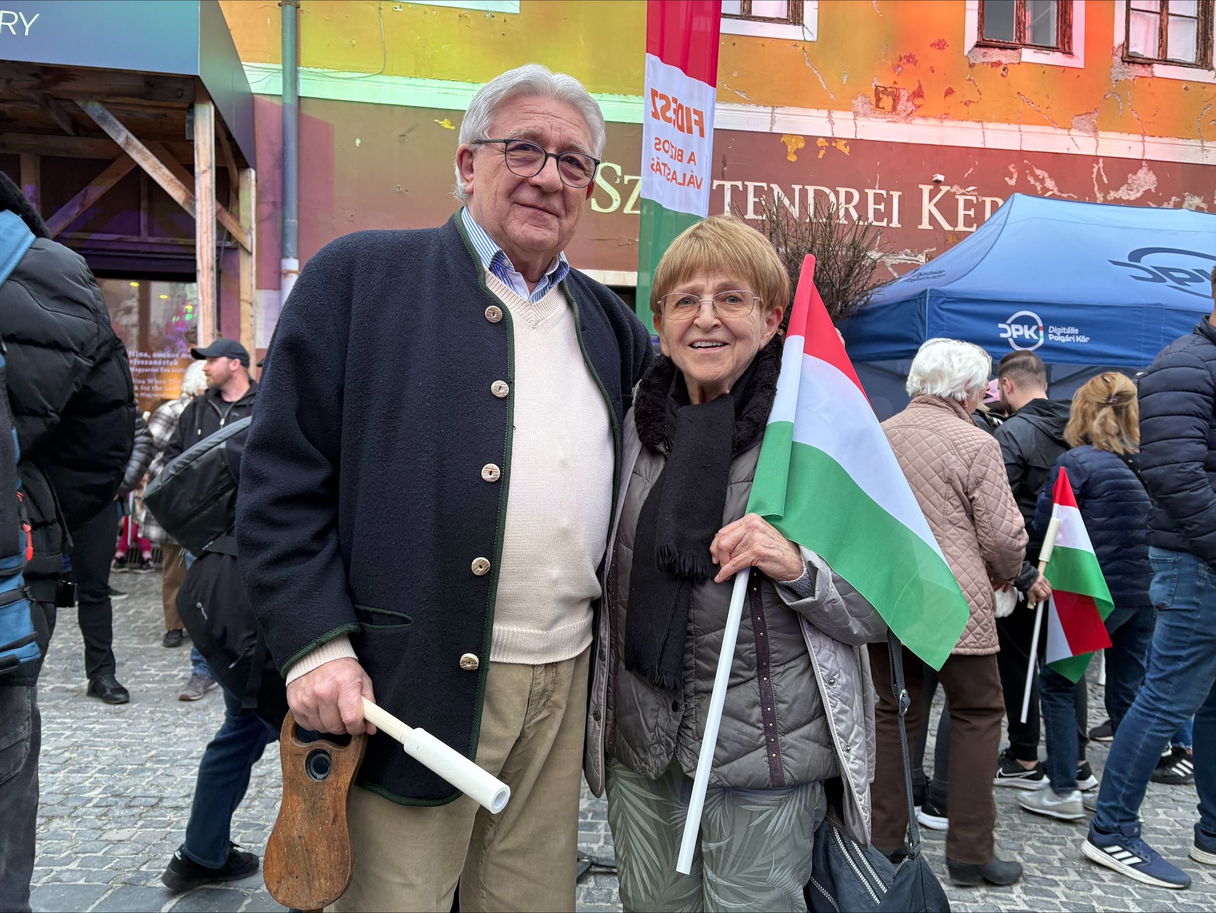 Zászlóval és fáklyával a kézben gyülekezett a tömeg Szentendrén a macskaköves Fő téren, ahol kék színű DPK-s sátrak és kék hátterű molinók álltak. Ezekből a kellékekből és színekből akár az is lehetett a benyomásunk, hogy a Tisza Párt rendezvényén vagyunk. Arra, hogy most itt a Fidesz is járja az országot, csak a kormánypárt nevének narancssárgán tündöklő felirata emlékeztetett nem túl nagy méretben egy-egy plakát szélén vagy a sátrak tetején.