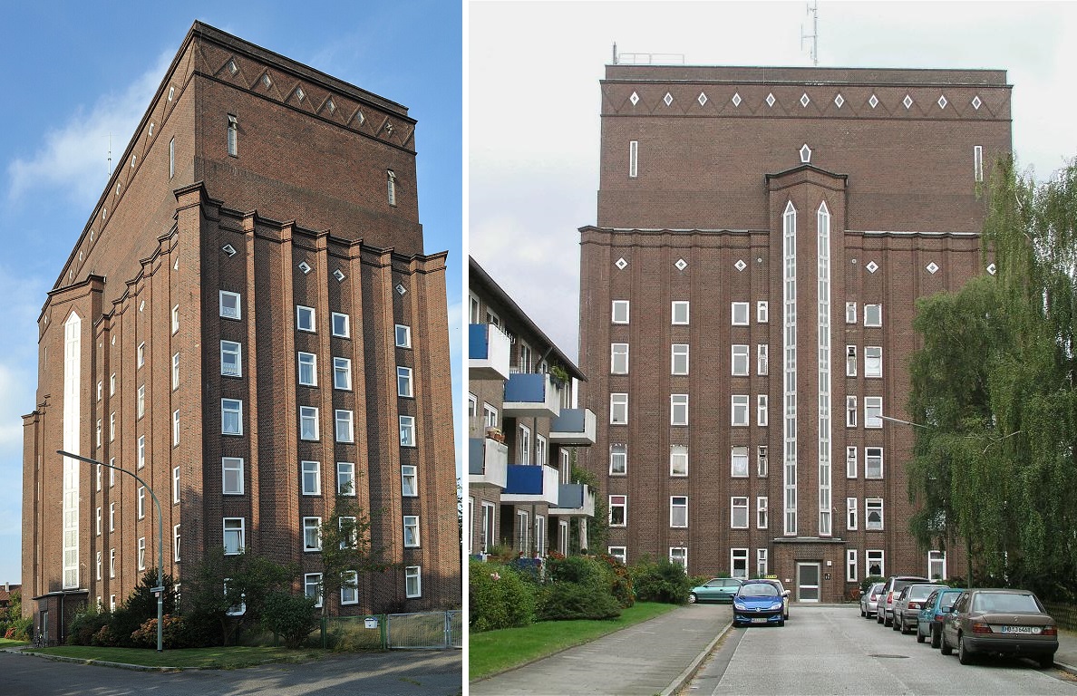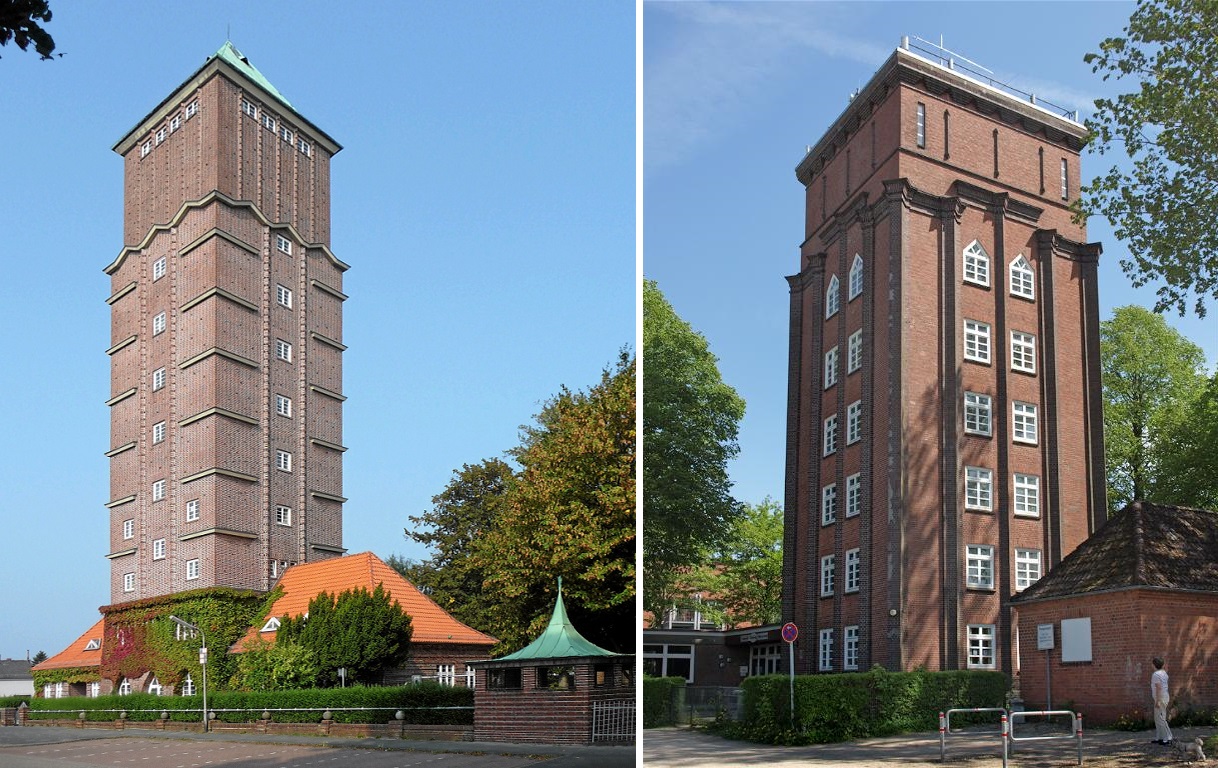 • a Bremen-Blumenthalban lévő példa (ép. Michael Fischer, 1928-1929) 50 méteres magasságával, illetve 300 köbméteres tárolókapacitásával,