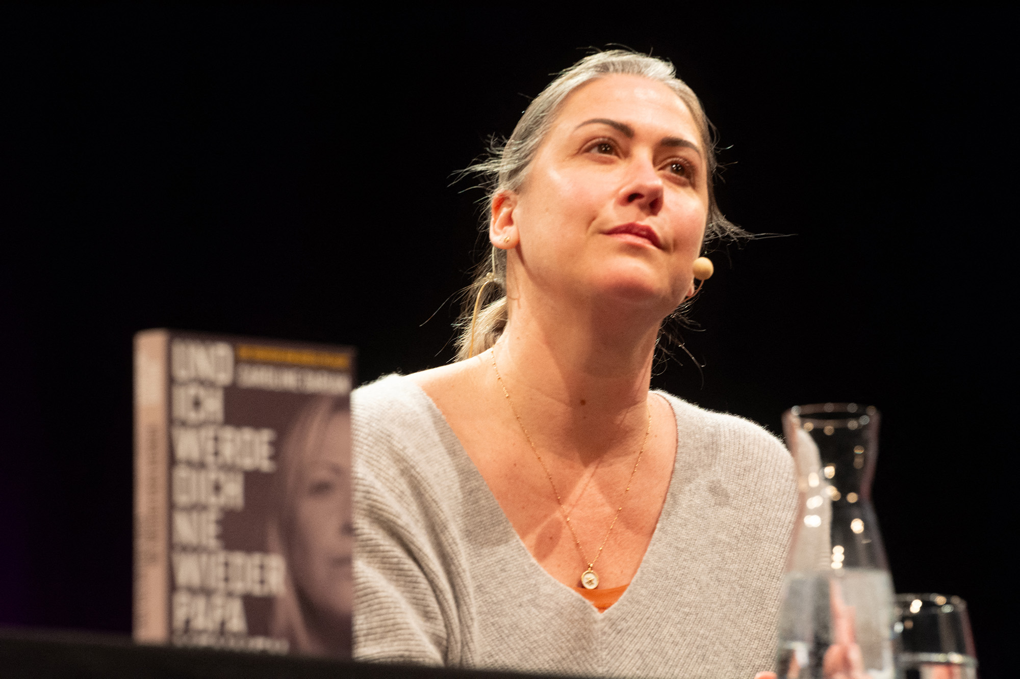 Ying Tang / NurPhoto / AFP Caroline Darian, Gisele Pelicot lánya, 2025. március 17-én a németországi Kölnben, a WDR Funkhaus színpadán, a lit.cologne nemzetközi irodalmi fesztiválon.