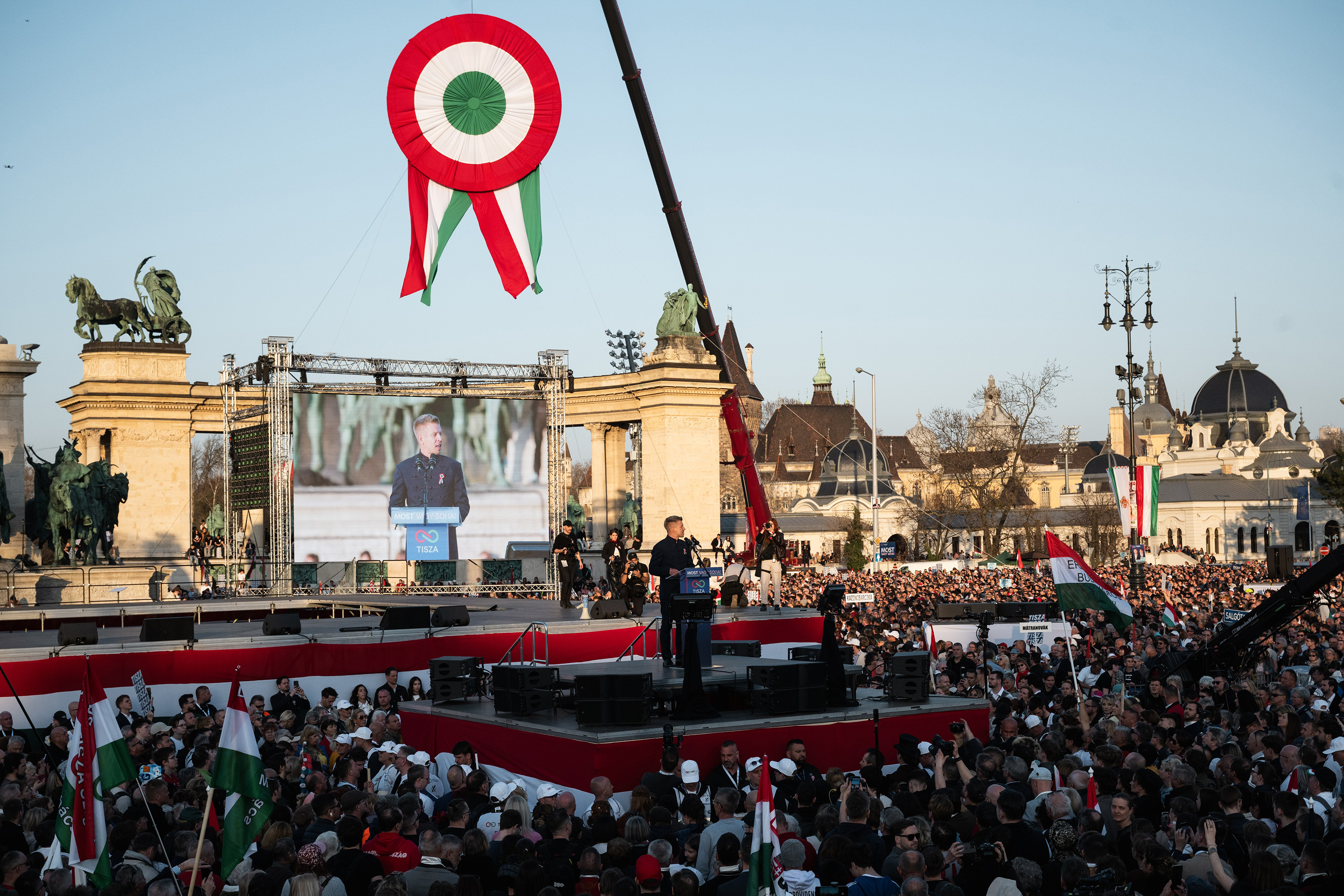 Szajki Bálint / 24.hu Rendszerváltó Nemzeti Menet néven tartott vonulásos megemlékezést a Tisza Párt az Andrássy úton és a Hősök terén, 2026. március 15-én.
