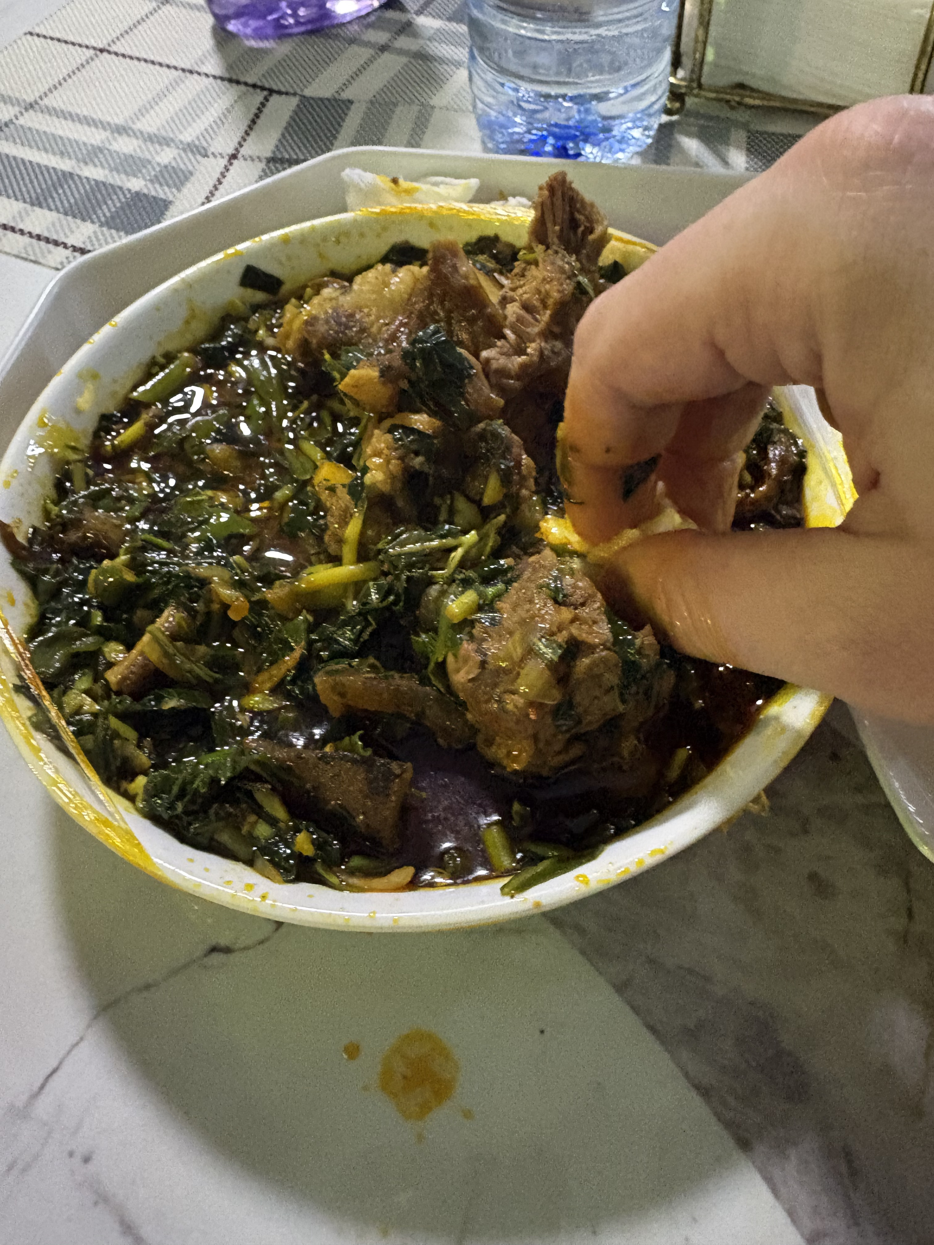 Alapvetően azért került a kezem a lébe, mert Ghánában így eszünk. Evőeszköz nem lelhető föl ezekben a vendéglátóegységekben. Akkor éppen fufuval, azaz maniókából és főzőbanánból készült lágy, ragacsos kvázi tésztával tálalták a menüt. Ebből tépünk, ezzel tunkolunk, így haladunk a leves fogyasztásával. A gasztronómiai és társadalmi élményt csöpp sült kecske komplettírozta.