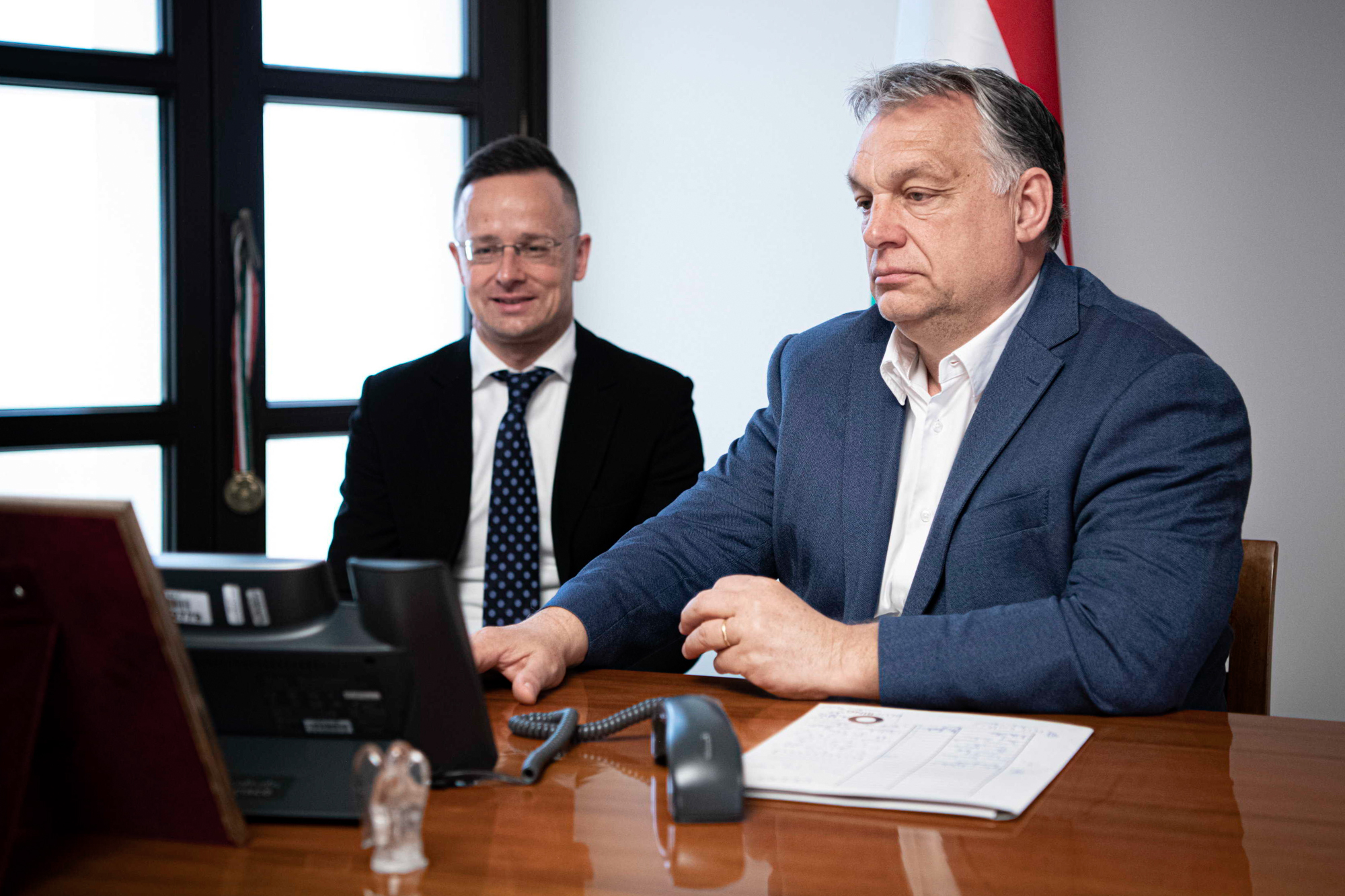 Benko Vivien Cher / Miniszterelnöki Sajtóiroda / MTI Orbán Viktor és Szijjártó Péter telefonon megbeszélést folytat Hszi Csin-ping kínai elnökkel a Karmelita kolostorban 2021. április 29-én.