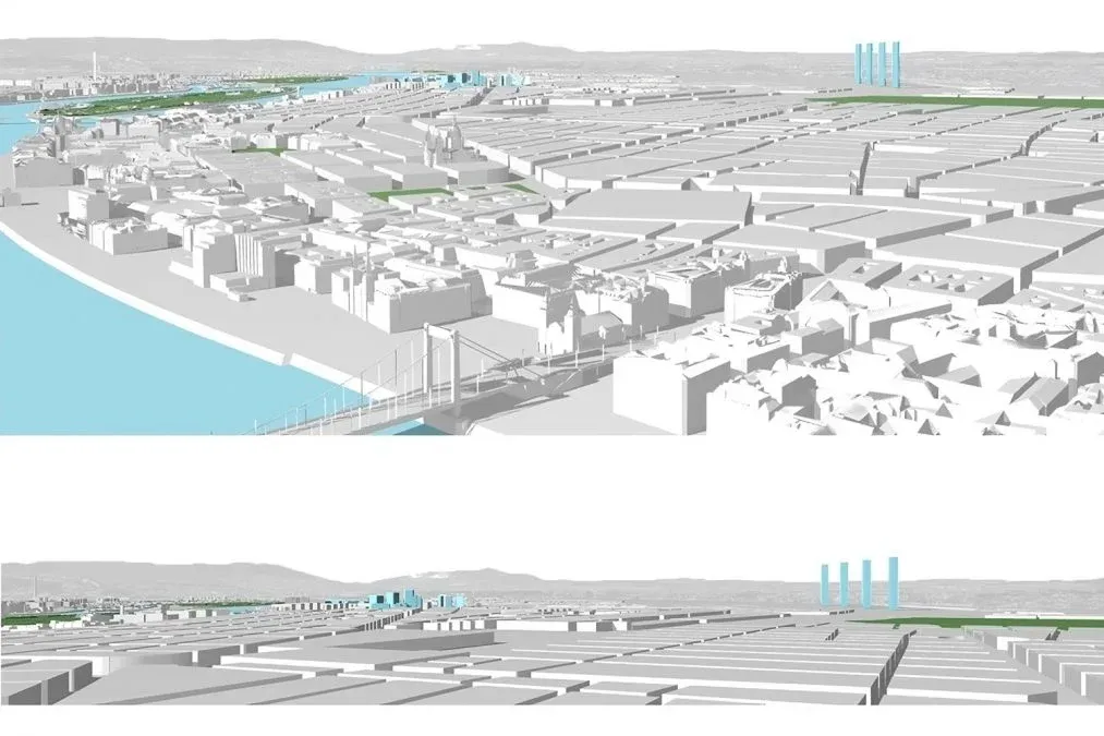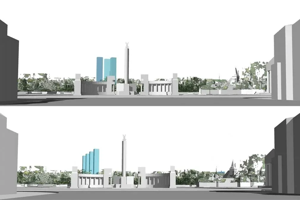 Főpolgármesteri Hivatal A főváros által korábban közölt ábrák egyikén a most már sosem megvalósuló 240 méteres tornyok a Hősök terére gyakorolt hatása látszik.