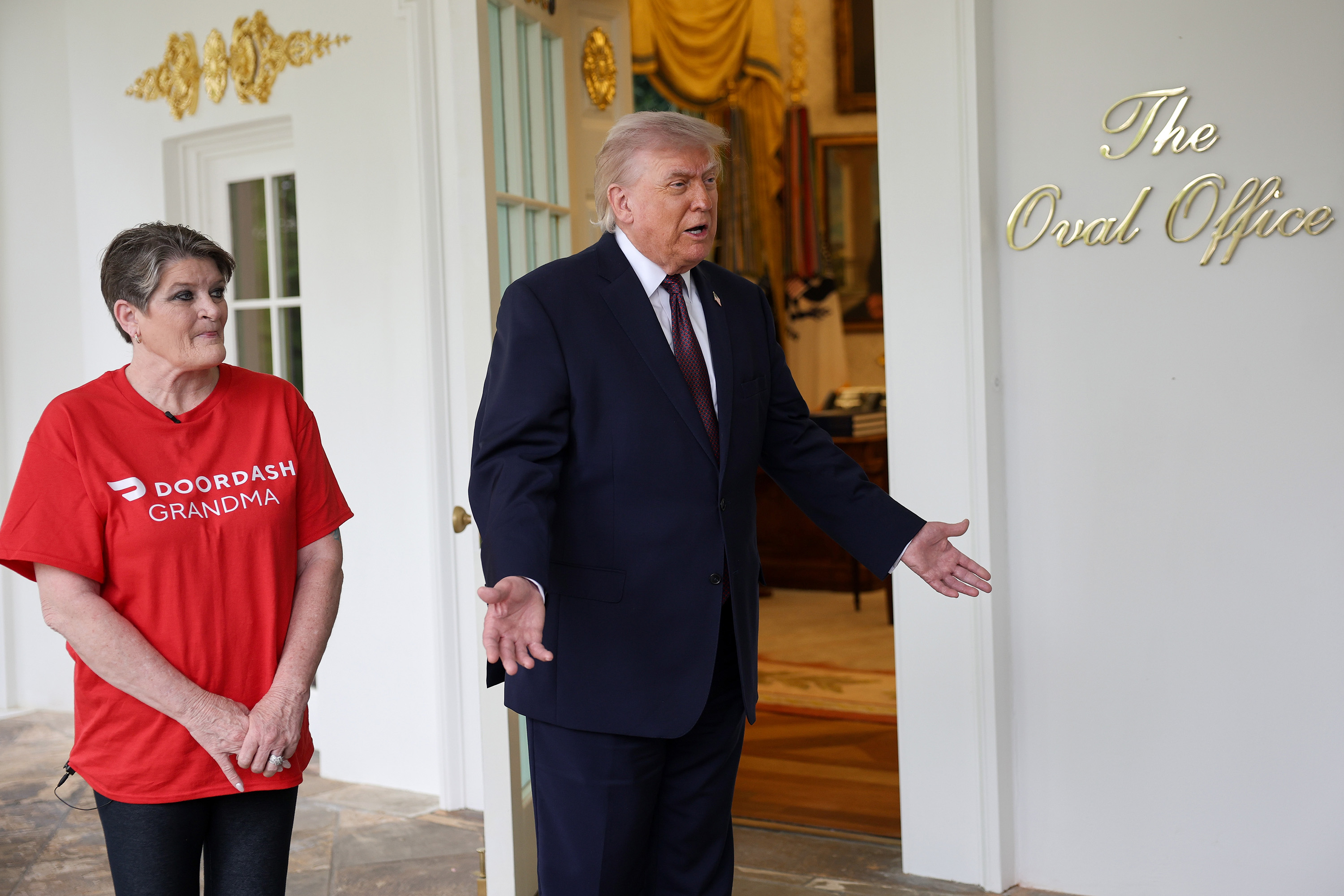 Win McNamee / Getty Images Donald Trump amerikai elnök Sharon Simmons társaságában nyilatkozik a sajtónak a Fehér Ház Ovális Irodája előtt 2026. április 13-án, Washingtonban.
