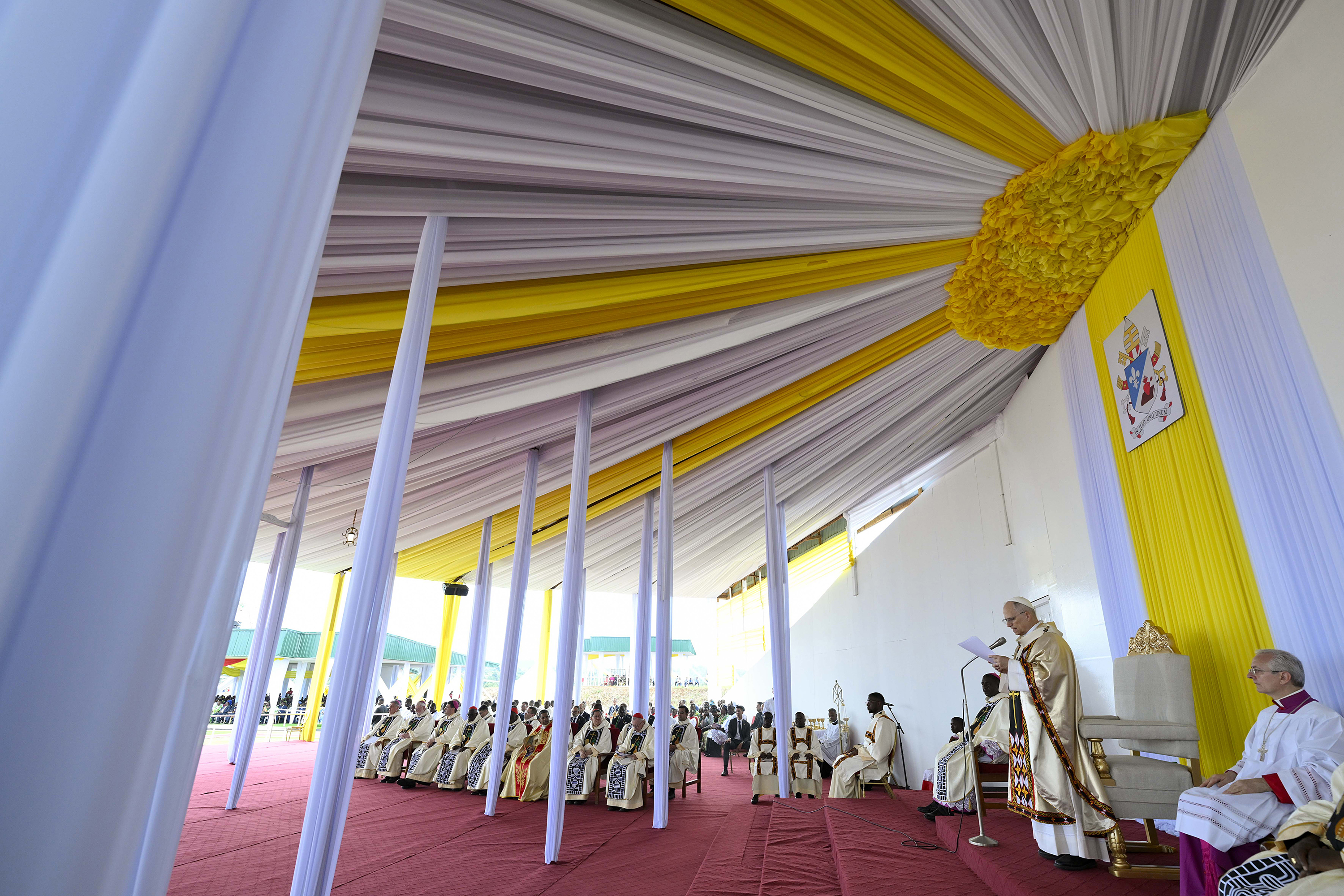 Simone Risoluti / VATICAN MEDIA / Getty Images XIV. Leo pápa szentmisét celebrál a Kamerun nyugati részén fekvő Bamenda városában 2026. április 16-án.