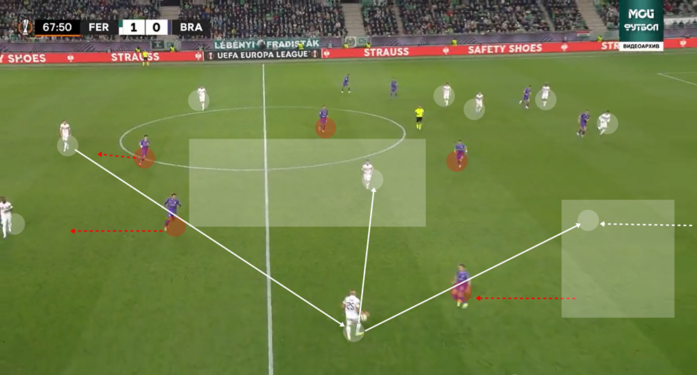Merthogy a szokatlan időpontban, szerda délután megrendezett visszavágó rémálomszerűen kezdődött a Fradi számára – már negyedóra után ledolgozta kétgólos hátrányát az ellenfél. A Braga játéka ezúttal már tényleg nagyon hasonlított az Alonso-féle 3-4-3-hoz, az emberfogással dolgozó, sokszor indokolatlanul nyitott, mindig kifelé rohanó Keane-csapatra jellemző védekezés pedig nagyon könnyen beadta a derekát – elég volt csak hátrapasszokkal kifelé csalogatni. A megnyílt területeken Grillitsch mellett ezúttal Gorby vette fel a labdát, a dominóként kidőlt védelmi vonalat a három támadó átlós irányú kifelé mozgásokkal cincálta szét – átlós manipuláció, az elmozgó játék legszebb formájában.